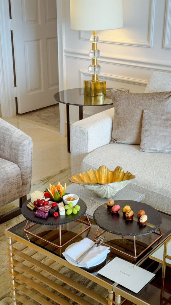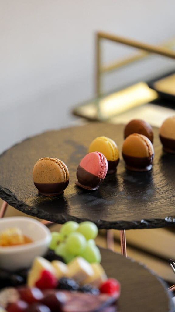 Upon arrival, I was greeted with the sweetest surprise… a selection of colourful macarons and a cheese plate waiting in my suite.