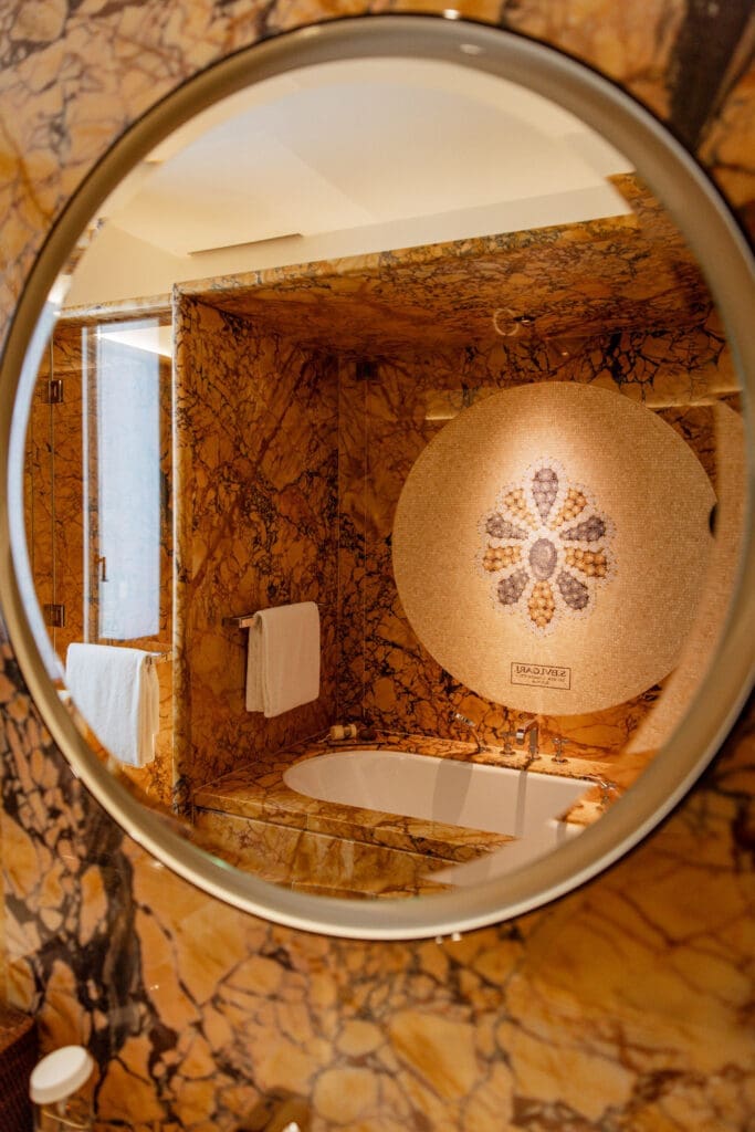 Each suite has its own palette of rare Mediterranean stones, ours glowed golden.