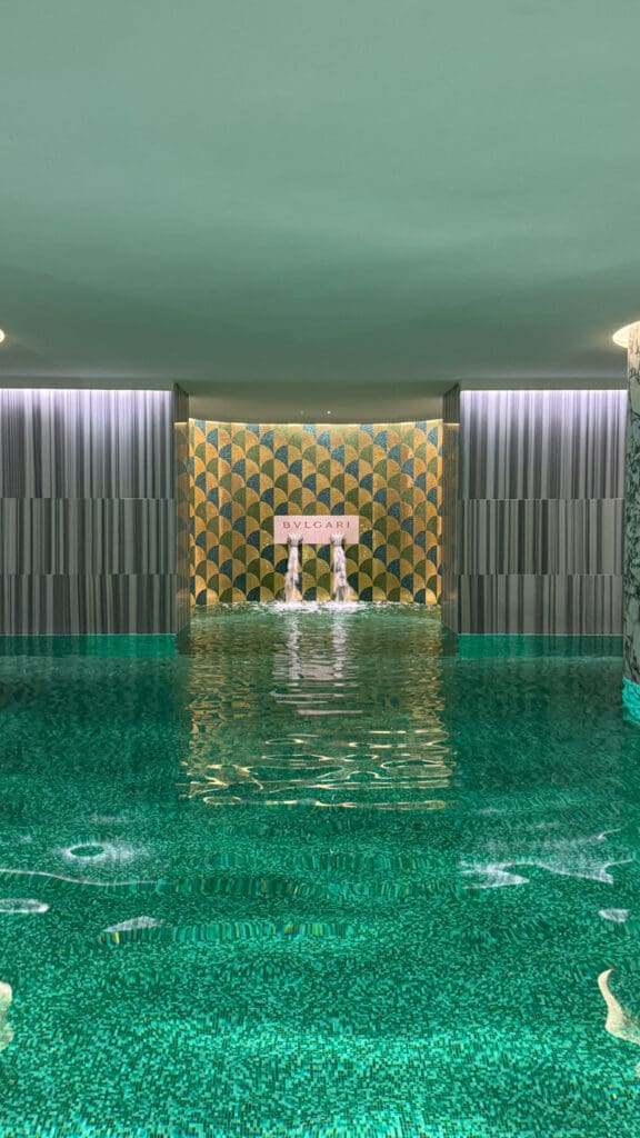 The Bvlgari Spa is inspired by ancient Roman baths, with marble, mosaic, gold, and soft light everywhere.