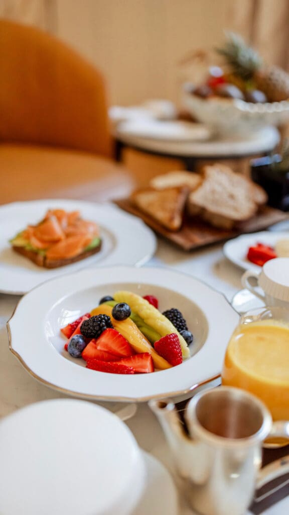 fresh fruit, pastries, pancakes, eggs, salmon avocado toast, chia pudding and cappuccinos with PERFECT foam.